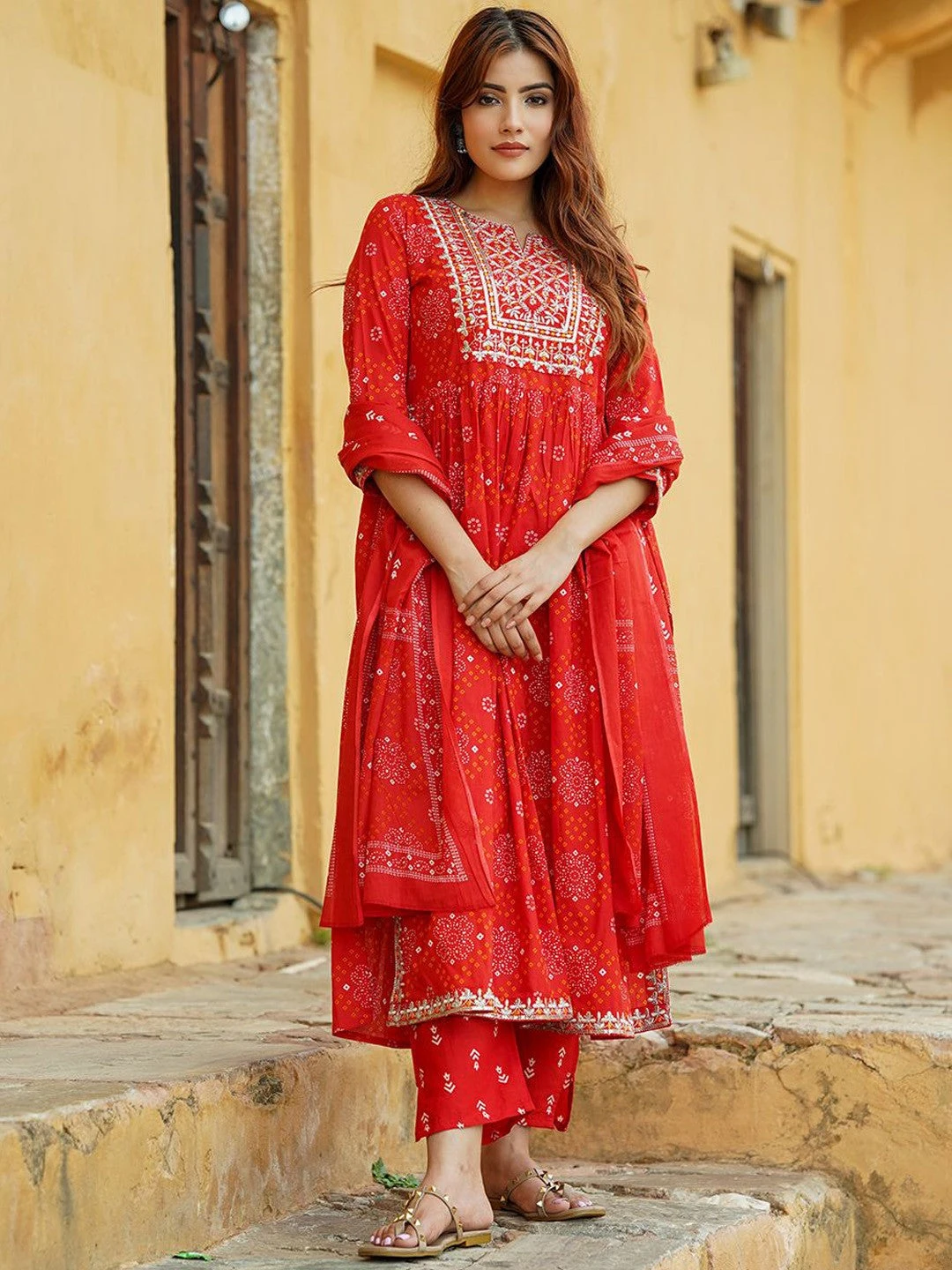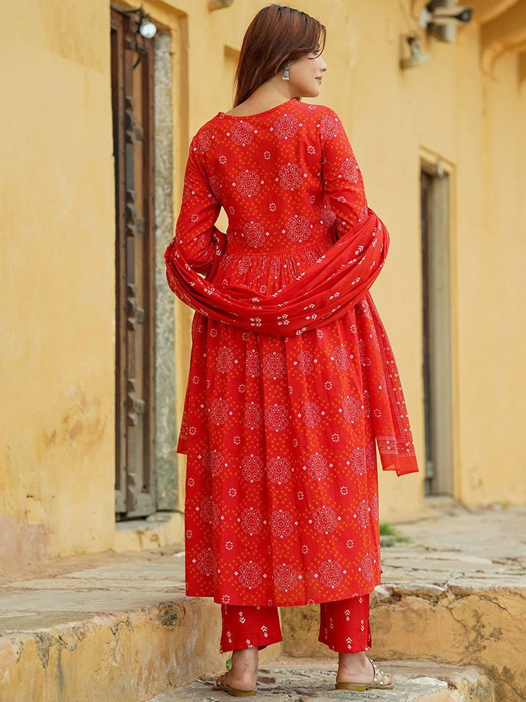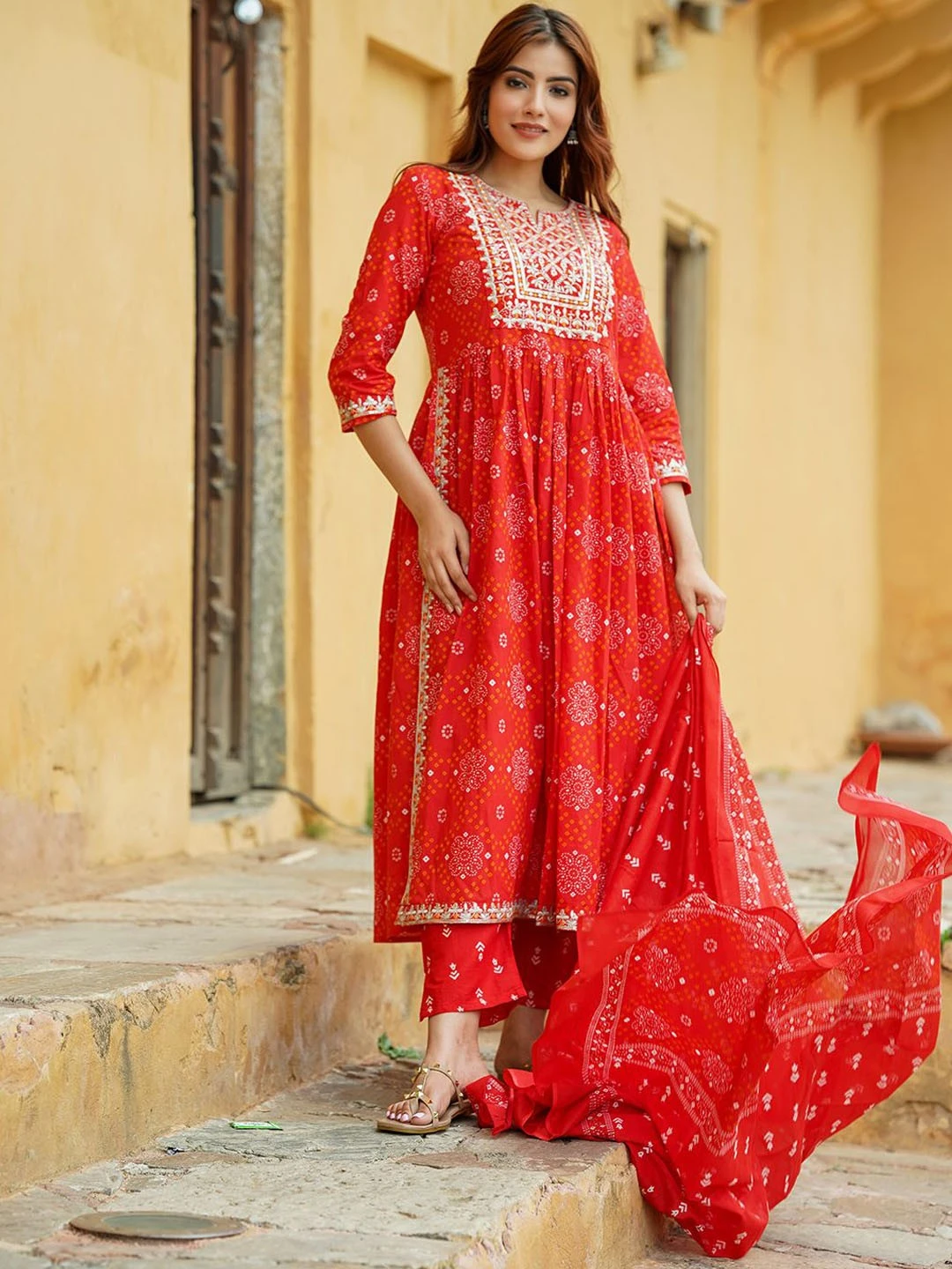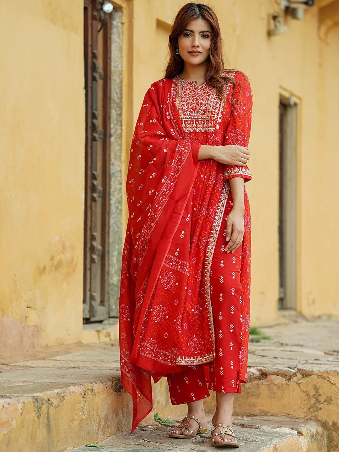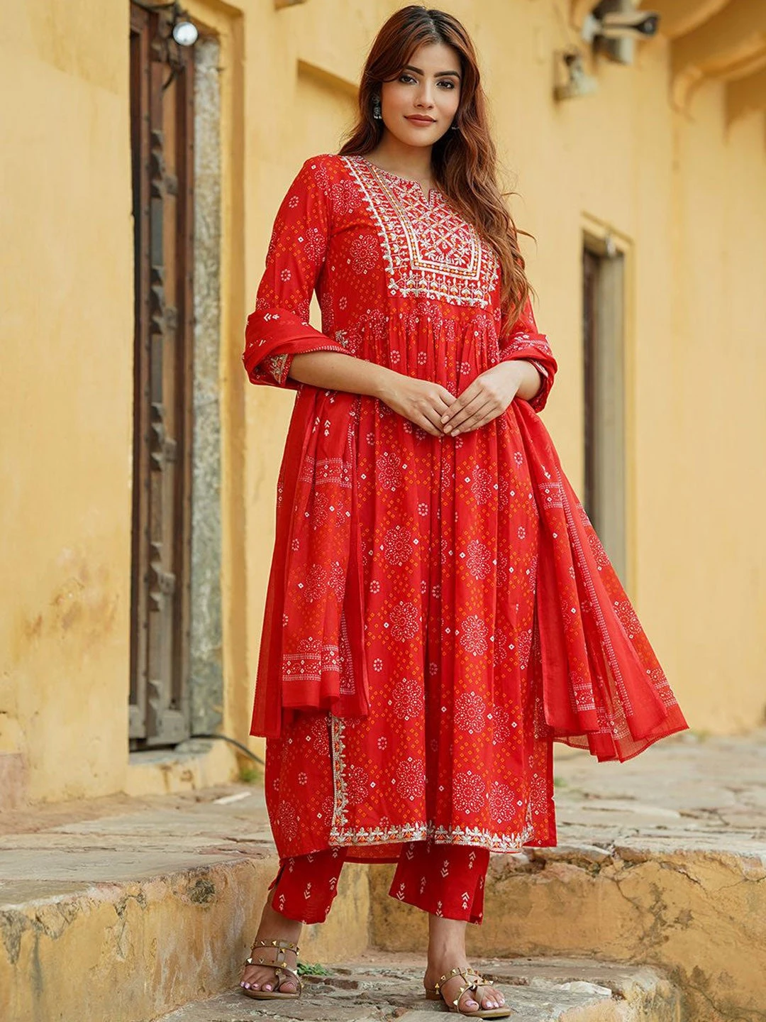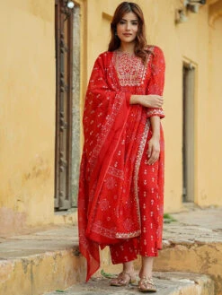 - Fabric: Bandhani Printed Thread Work Pure Cotton A-Line Kurta Set