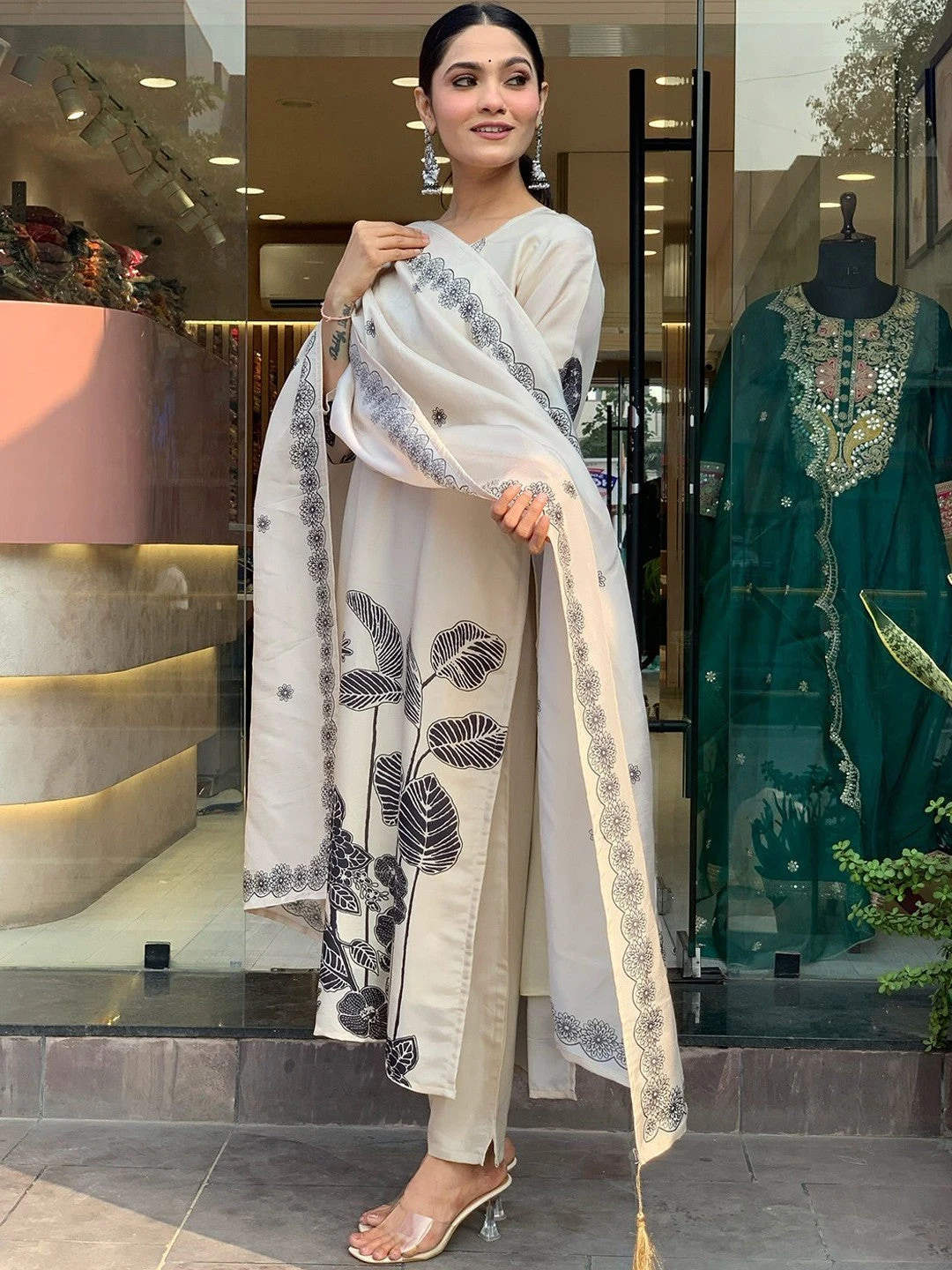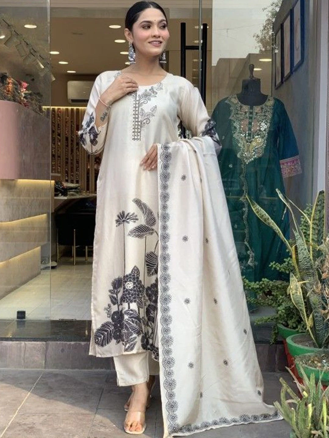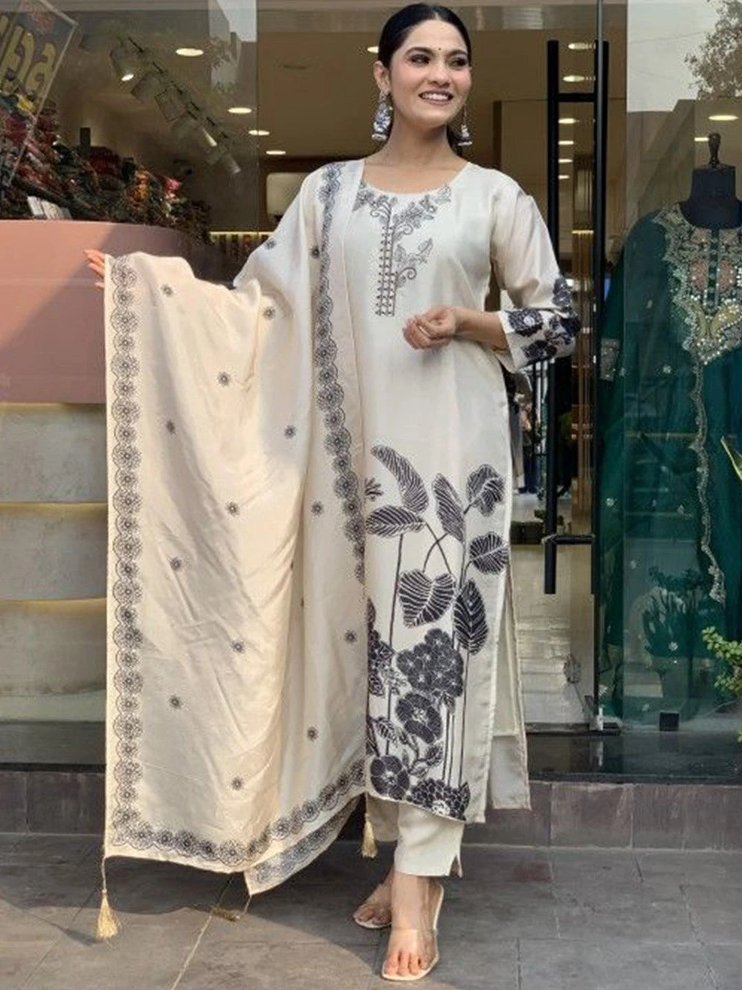 - Fabric: Floral Printed Round Neck Pure Silk Straight Kurta Set