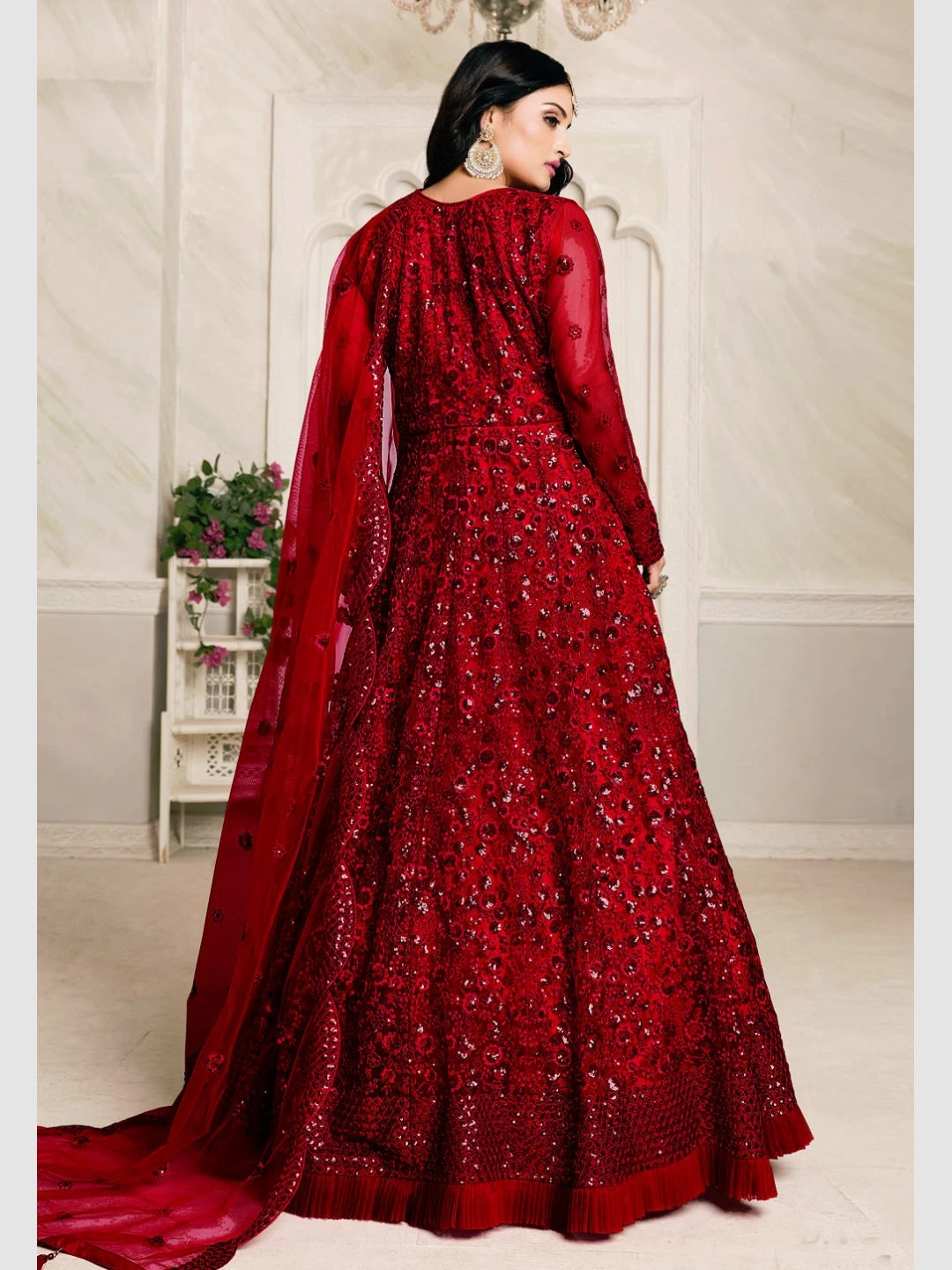✪ This Anarkali dress can be stitched with maximum bust size of 42 inches only.- Top: Embroidery on Net with Sequence