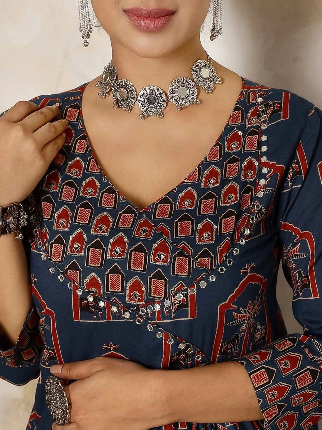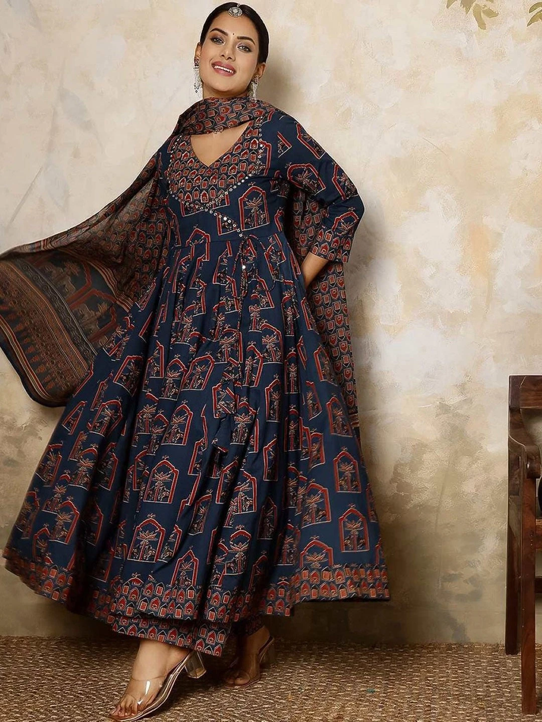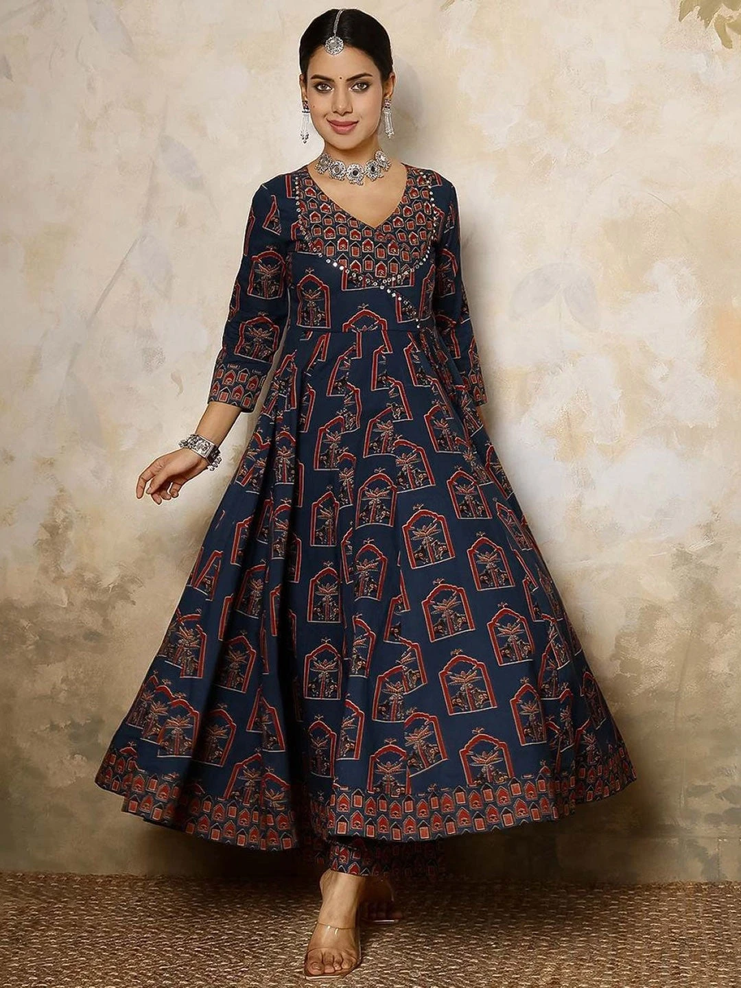 - Fabric: Floral Printed Regular Thread Work Cotton Kurta Set